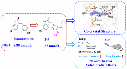 特发性肺纤维化IPF是一种临床需求远远未满足的纤维化间质性肺病,尚无理想治疗药物。PDE4是一个抗IPF药物开发的有效靶标,近期其抑制剂在一项治疗IPF三期试验中取得成功,是十年来第一个获得成功的IPF三期临床试验。然而,PDE4抑制剂普遍存在的呕吐等副作用是限制其临床应用的主要因素,而结构新颖的天然PDE4抑制剂被证明有相对较高的安全性。团队综合应用(天然)药物化学、结构生物学、药理学等多学科的技术手段,发现一类天然的稀有类黄酮化合物异橙酮对PDE4具有中等的抑制活性,在共晶结构的指导下快速进行结构优化获得了一个活性、选择性及类药性均衡的先导化合物2-9,且在体内外药理模型中都证实化合物2-9具有显著的抗肺纤维药效,具有良好的开发前景。