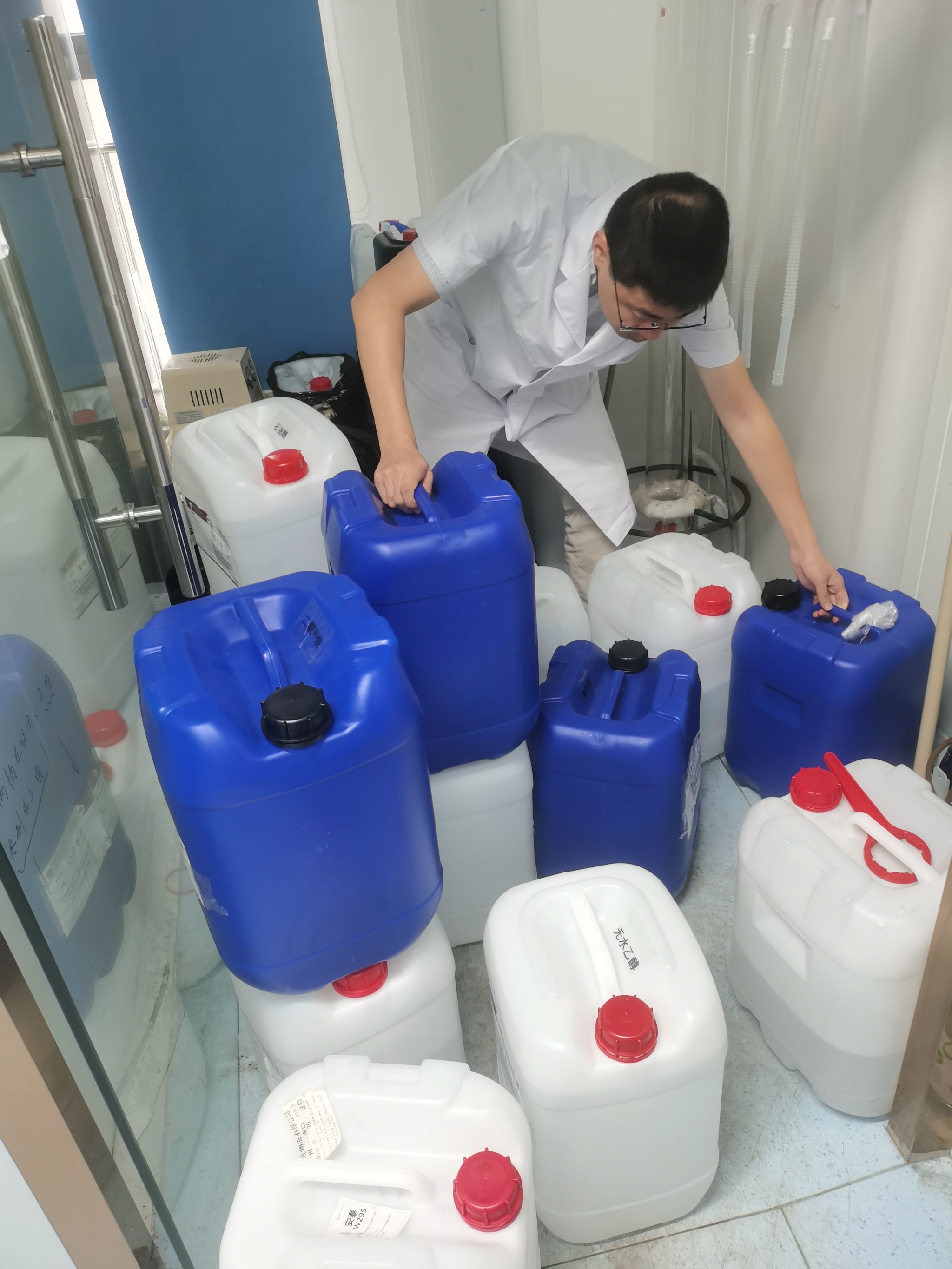 检查发现实验室存在的主要问题有:1)个别实验室大桶试剂严重超标;2)部分实验室研究生做实验没有养成穿实验服的习惯;3)个别实验室大桶试剂放倒存放容易造成泄漏;4)个别实验室无废液区和无废液桶。