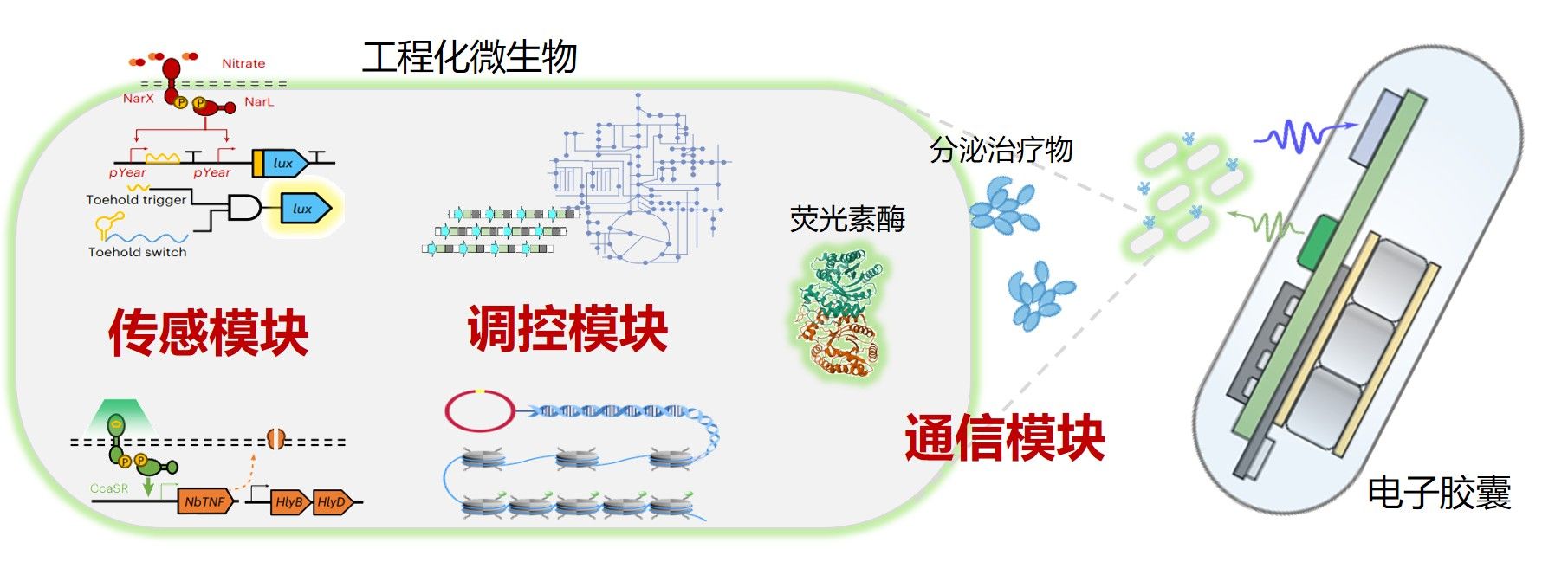 紧密围绕合成生物学、微电子工程学、光遗传学、纳米材料制备等研究方向,在工程菌底盘的合成生物学设计再造、“机体—工程菌”信号感知交流用于疾病治疗、工程菌与胶囊化电子器件交互系统构建等方面取得了系列创新。